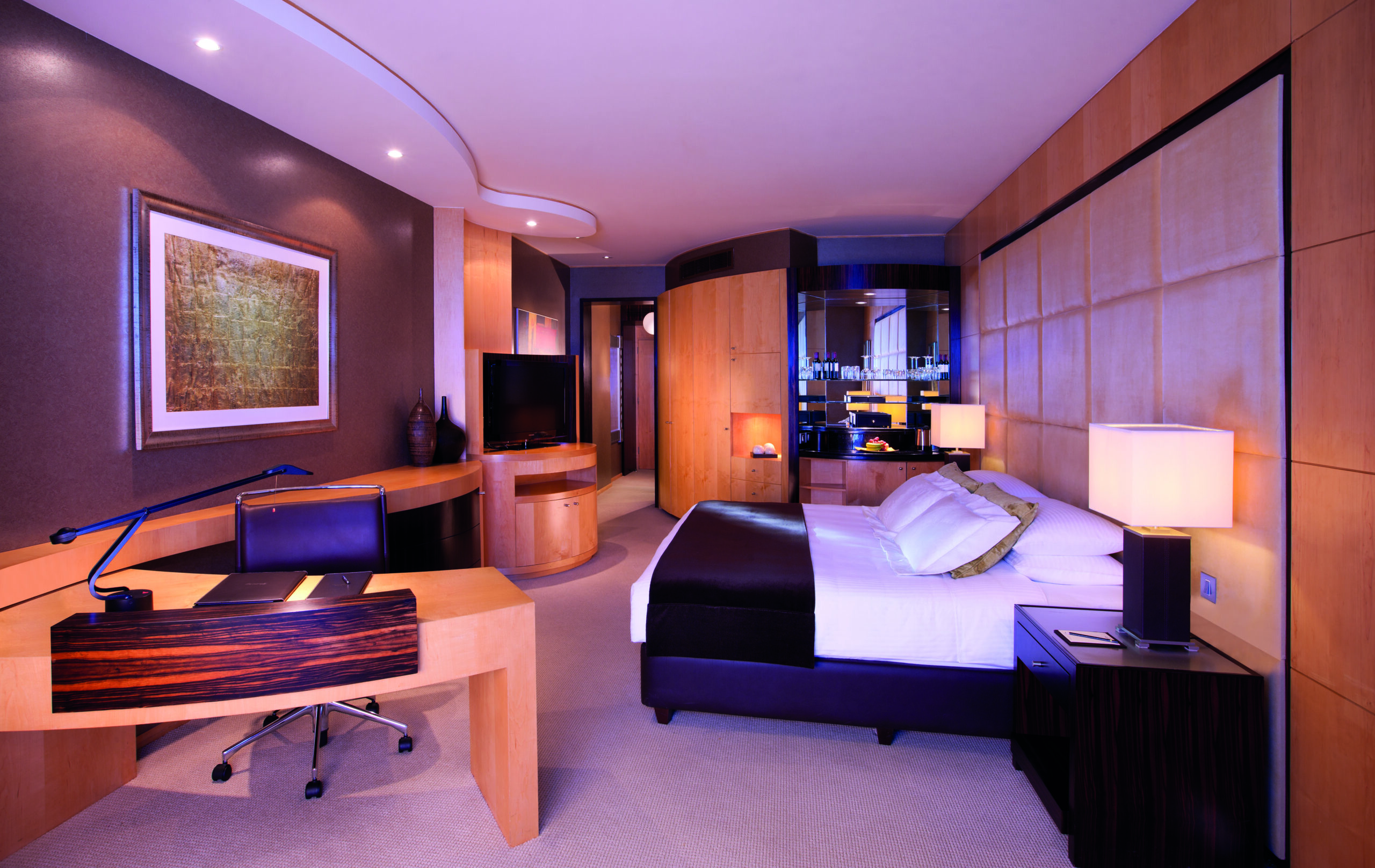 Careful selection of maple veneers and hardwoods were utilized to meet the brief of Arabian inspired luxury in warm earthy tones. With curve fronted wardrobes, desks, and cabinetry each room presents a highly artistic and sculptural blend of functionality and comfort for the guest, all constructed with the finest of materials and the highest standards of timber craftsmanship.